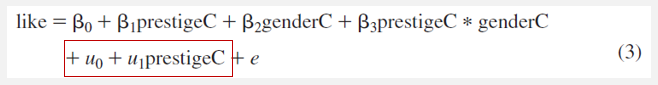 똑같이 두 수준을 갖는 독립변인을 추가했는데, 식(3)에 비해 식(4)에서는 무선효과 구조가 굉장히 복잡해졌다.