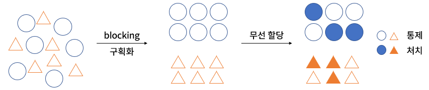 이렇게 구획을 나누고 각 구획 내에서 처치 조건과 통제 조건을 무선적으로 할당하는 방법이 무선화된 구획 설계이다.